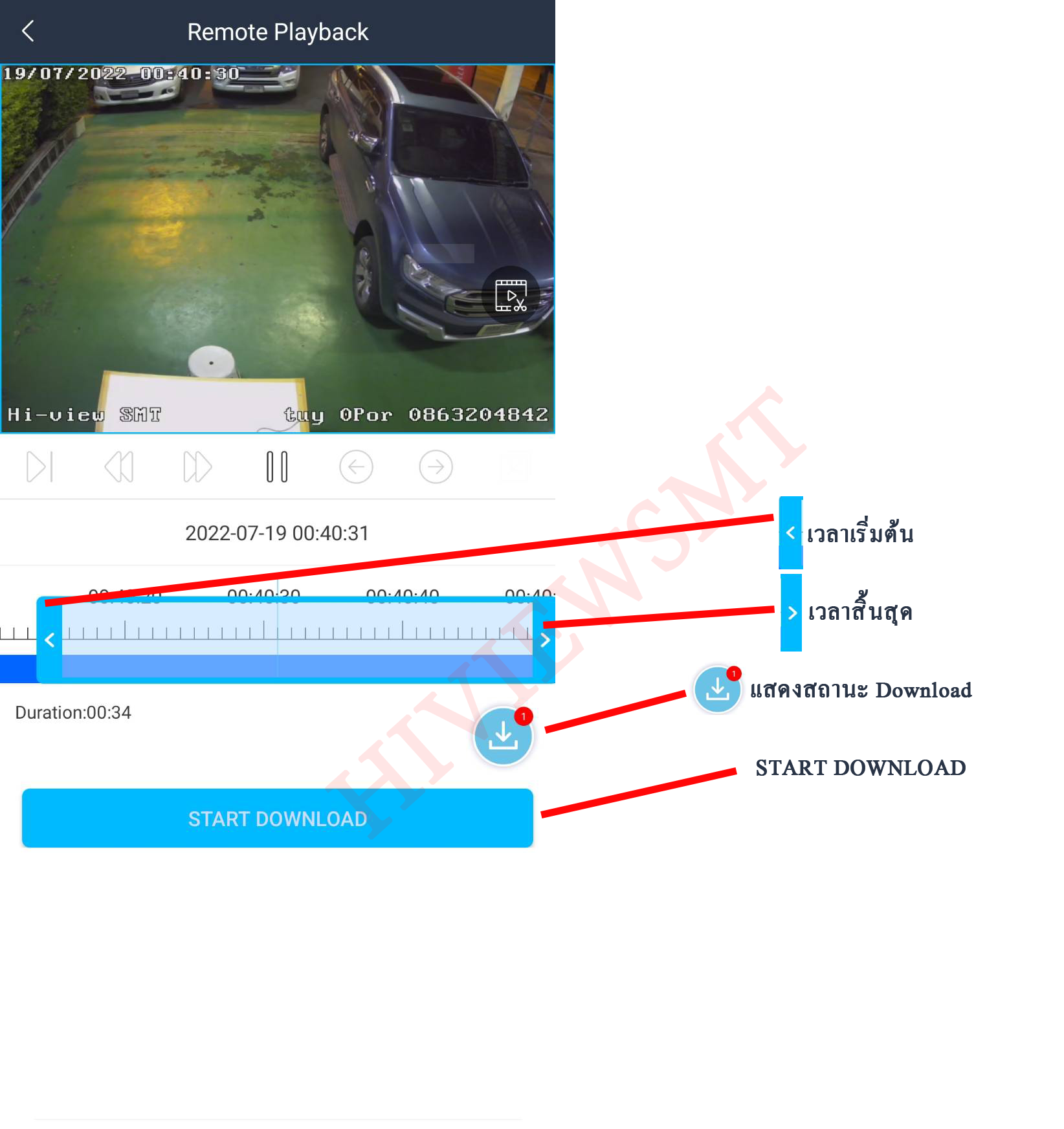 3. หน้าสำรองข้อมูล เลื่อนเเถบช่วงเวลาสีน้ำเงินไปช่วงเวลาที่ต้องการแล้วทำการกำหนด เวลาเริ่มต้น - เวลาสิ้นสุด ช่วงเวลาที่ต้องการสำรองข้อมูล สูงสุด 30 นาที > START DOWNLOAD