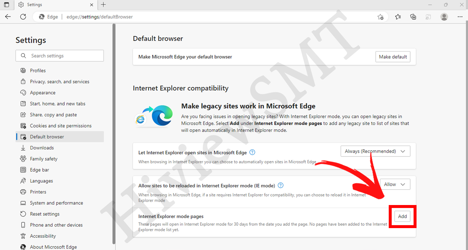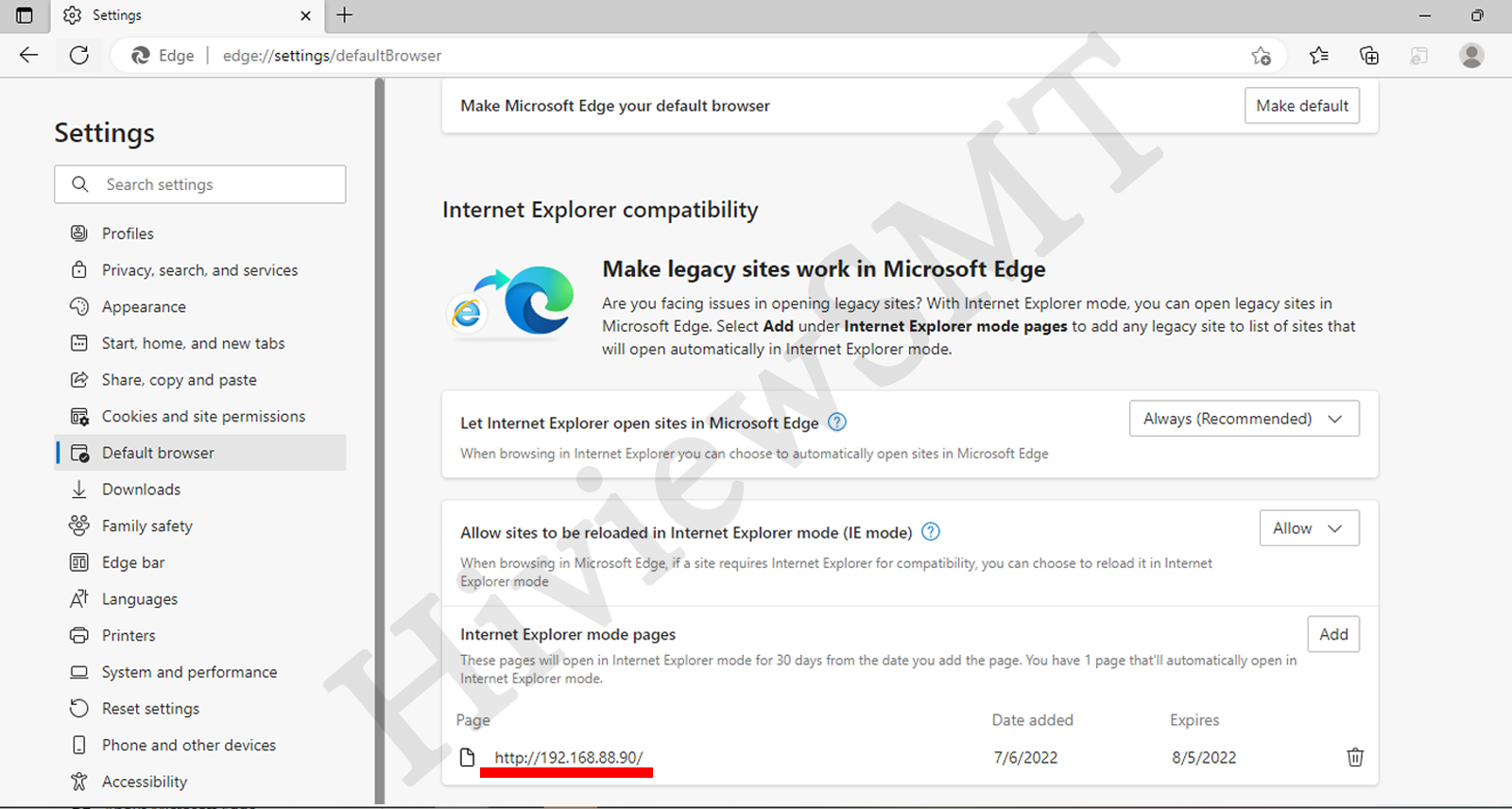 4. Internet Explorer mode pages > Add ไอพี หรือ เว็บไซต์ที่ต้องการใช้โหมด IE