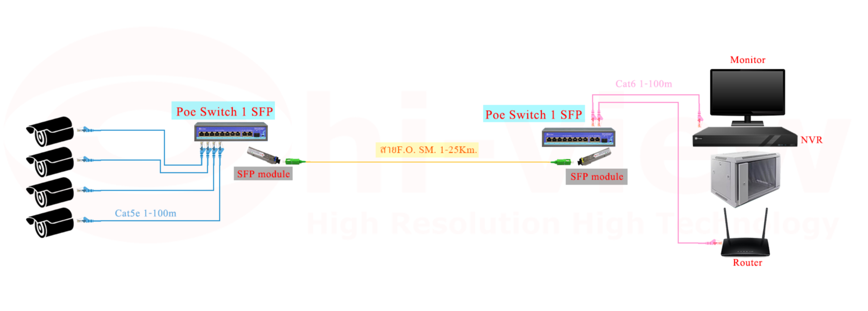 แน่นอนว่า การเดินสายเรื่องสัญญาณต้องดีกว่าไร้สายใช้งานเป็นคลื่นสัณญาณต่างๆ สายที่ใช้งานที่สามารถเดินระยะที่ไกลต้องเป็นสาย Fiber แน่นอน นอกจากสายเราต้องการอุปกรณ์ แปลงสัณญาณเช่น Media converter , sfp ตัวที่แปลง fiber ให้เป็น Lan