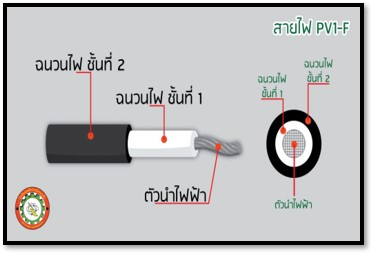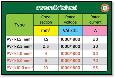 การติดตั้งระบบผลิตไฟฟ้าพลังงานแสงอาทิตย์ ต้องใช้สายไฟโซล่าเซลล์โดยเฉพาะ ที่ต้องมีความสามารถในการทนอุณหภูมิได้ไม่ต่ำกว่า 80 องศาเซลเซียส ซึ่งสายไฟโซล่าเซลล์จะเรียกว่า PV / PV1-F ภายในสายไฟโซล่าเซลล์ PV1-F ประกอบด้วยสายเส้นเล็กๆ จำนวนมาก เพราะไฟฟ้าระบบกระแสตรง จะวิ่งที่ผิวของสายไฟเส้นเล็กๆ มีค่าความสูญเสียทางไฟฟ้าน้อยกว่าที่ใช้สายไฟโซล่าเซลล์เส้นใหญ่ๆเพียงเส้นเดียว และสายยังเคลือบด้วยดีบุกเพื่อป้องกันการกัดกร่อน หรือตะใคร่เมื่อเกิดความชื้น