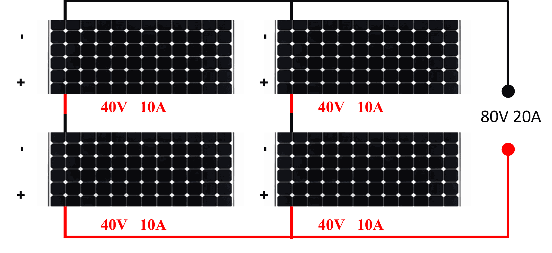 การต่อแบบขนาน – คือนำขั้วบวกของโซล่าเซลล์แผงหนึ่งไปต่อกับขั้วบวกของโซล่าเซลล์อีกแผงหนึ่ง และนำขั้วลบแผงหนึ่งไปต่อกับขั้วลบอีกแผงหนึ่ง การต่อแบบนี้จะทำให้กระแสไฟฟ้าเพิ่มขึ้นแต่แรงดันเท่าเดิม ตัวอย่างถ้ามีแผงโซล่าเซลล์ตามรูปด้านล่าง 2 แผงนำมาต่อแบบขนานจะได้แรงดันรวมของระบบ 40 โวลต์และกระแสไฟฟ้ารวม 20 แอมป์