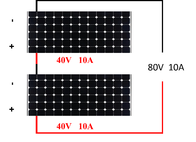 การต่อแบบอนุกรม – คือนำขั้วบวกของโซล่าเซลล์แผงหนึ่งมาต่อกับขั้วลบอีกแผงหนึ่งไปเรื่อย ๆ จนได้แรงดันตามระบบที่ออกแบบไว้ การต่อแบบอนุกรมนี้จะทำให้แรงดันไฟฟ้าเพิ่มขึ้นแต่กระแสในระบบจะเท่าเดิม ตัวอย่าง ถ้ามีแผงโซล่าเซลล์แรงดัน 40 โวลต์ กระแส 10 แอปม์ 2แผง มาต่ออนุกรมกันจะได้แรงดันรวมจะอยู่ที่ 80 โวลต์ และ กระแสรวม 10 แอมป์