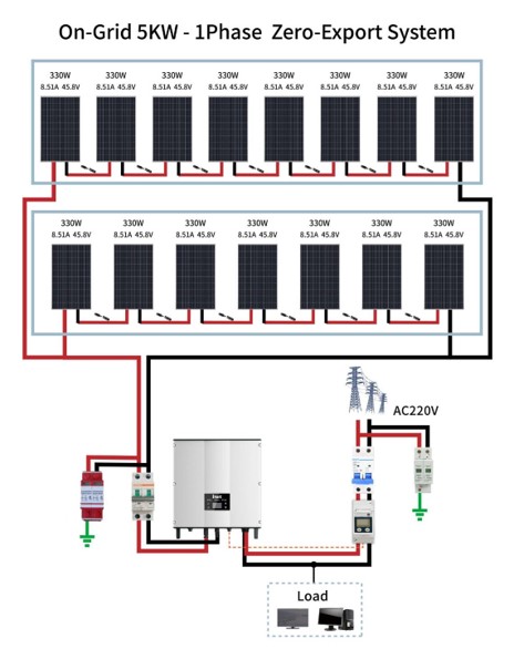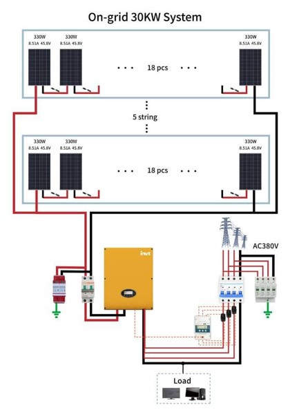 เป็นระบบโซลาร์เซลล์แบบต่อเข้ากับระบบสายส่งจากการไฟฟ้า (ไฟบ้าน) การผลิตไฟฟ้าระบบนี้จะใช้แผงโซลาร์เซลล์สำหรับการกำเนิดไฟฟ้า หลังจากนั้นจะจ่ายไฟให้กับอินเวอร์เตอร์ (Inverter) แปลงไฟฟ้ากระแสตรง (DC) เป็นไฟกระแสสลับ (AC) และจะต่อเข้ากับระบบไฟบ้าน เพื่อใช้งานร่วมกันต่อไป ระบบออนกริดเป็นอีกหนึ่งทางเลือกในการช่วยประหยัดพลังงาน ซึ่งระบบนี้เหมาะกับการใช้งานในตอนกลางวันเท่านั้น เช่น บ้านที่มีการใช้งานในตอนกลางวัน อาคารสำนักงานที่ทำงานตอนกลางวัน วัด โรงเรียน มหาวิทยาลัย หรือ ออฟฟิต เป็นต้น
