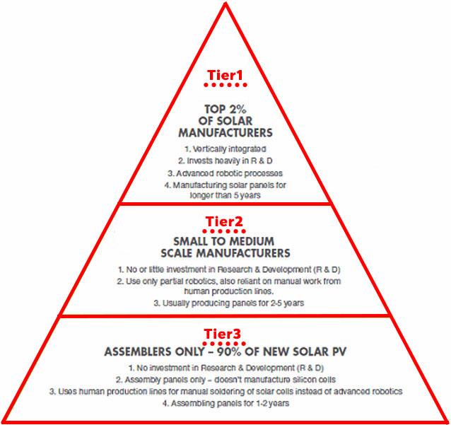 Tier 1 คือ แผงโซล่าเซลล์ ที่ผลิตจากผู้ผลิตที่มีโรงงาน และมีแบรนด์เป็นของตัวเอง มีความน่าเชื่อถือสูงที่สุด